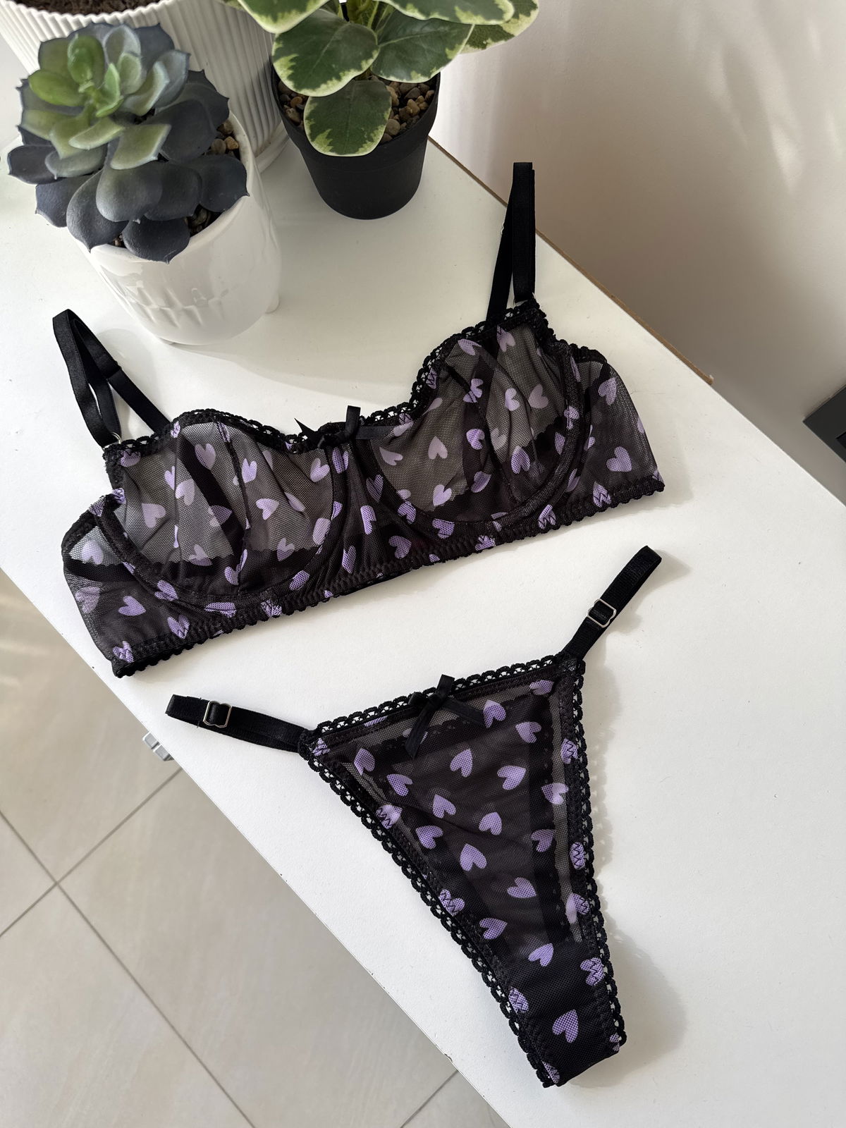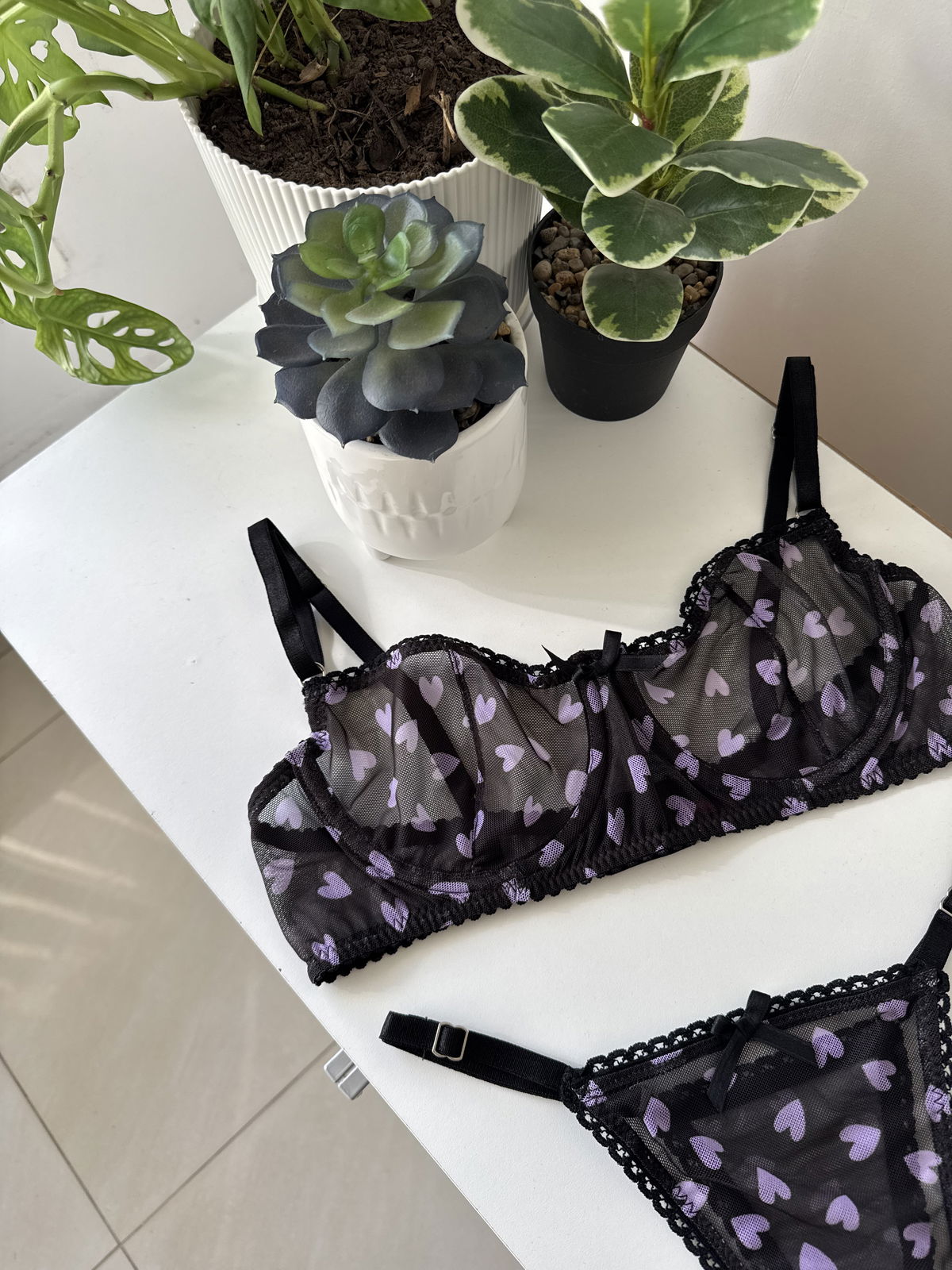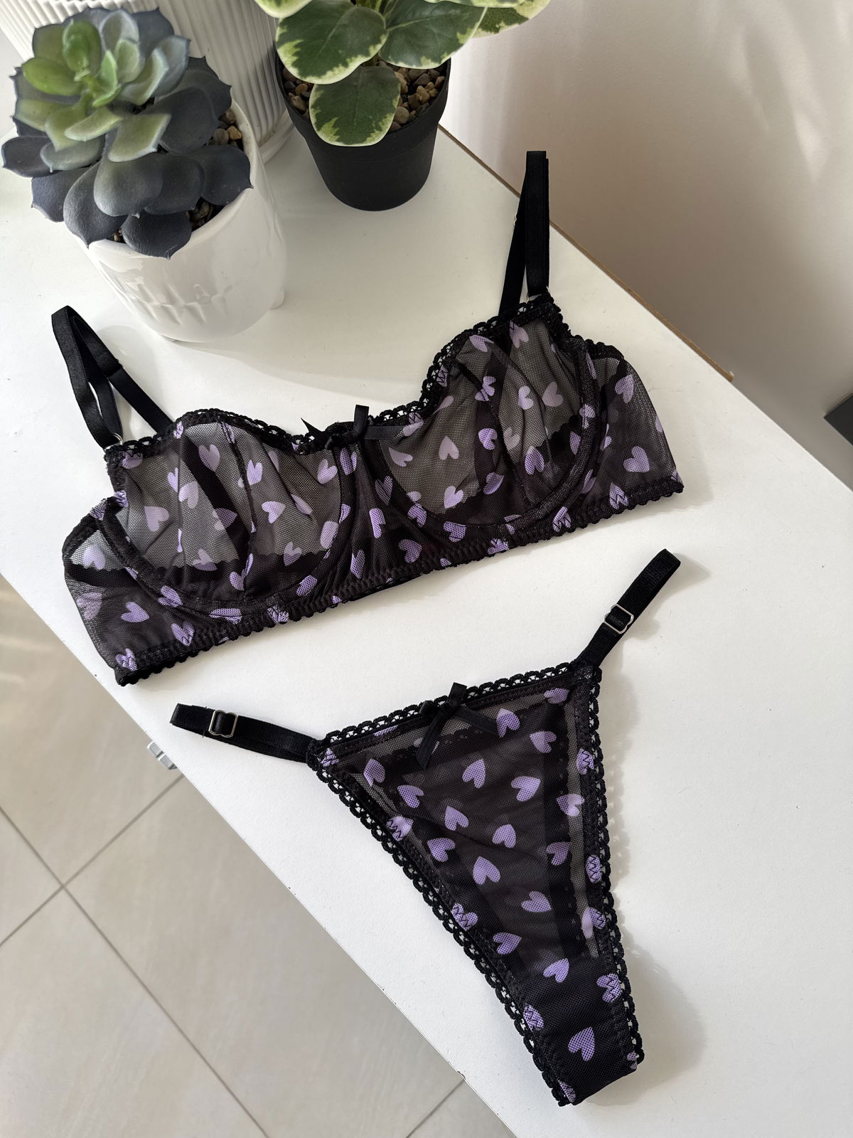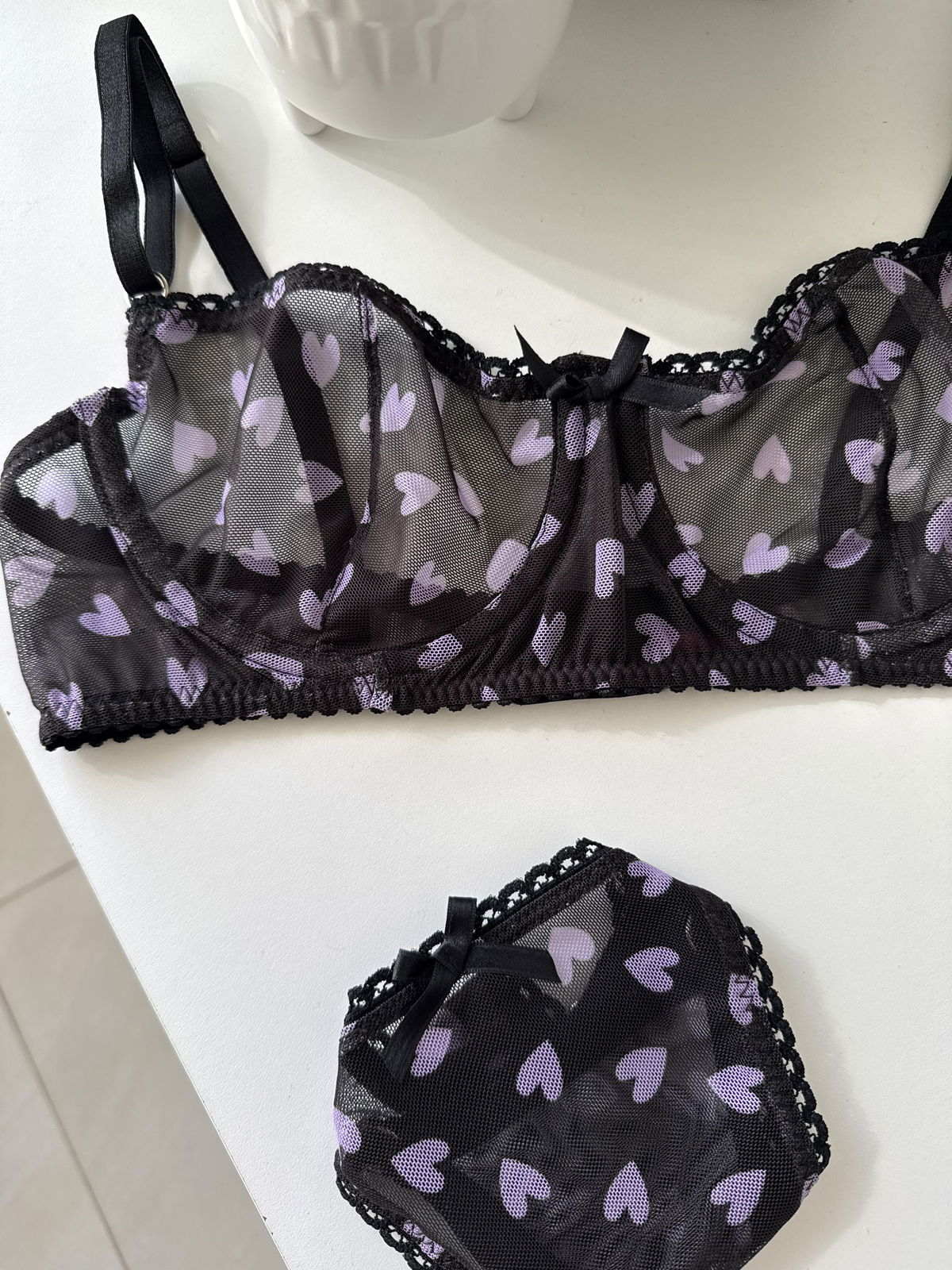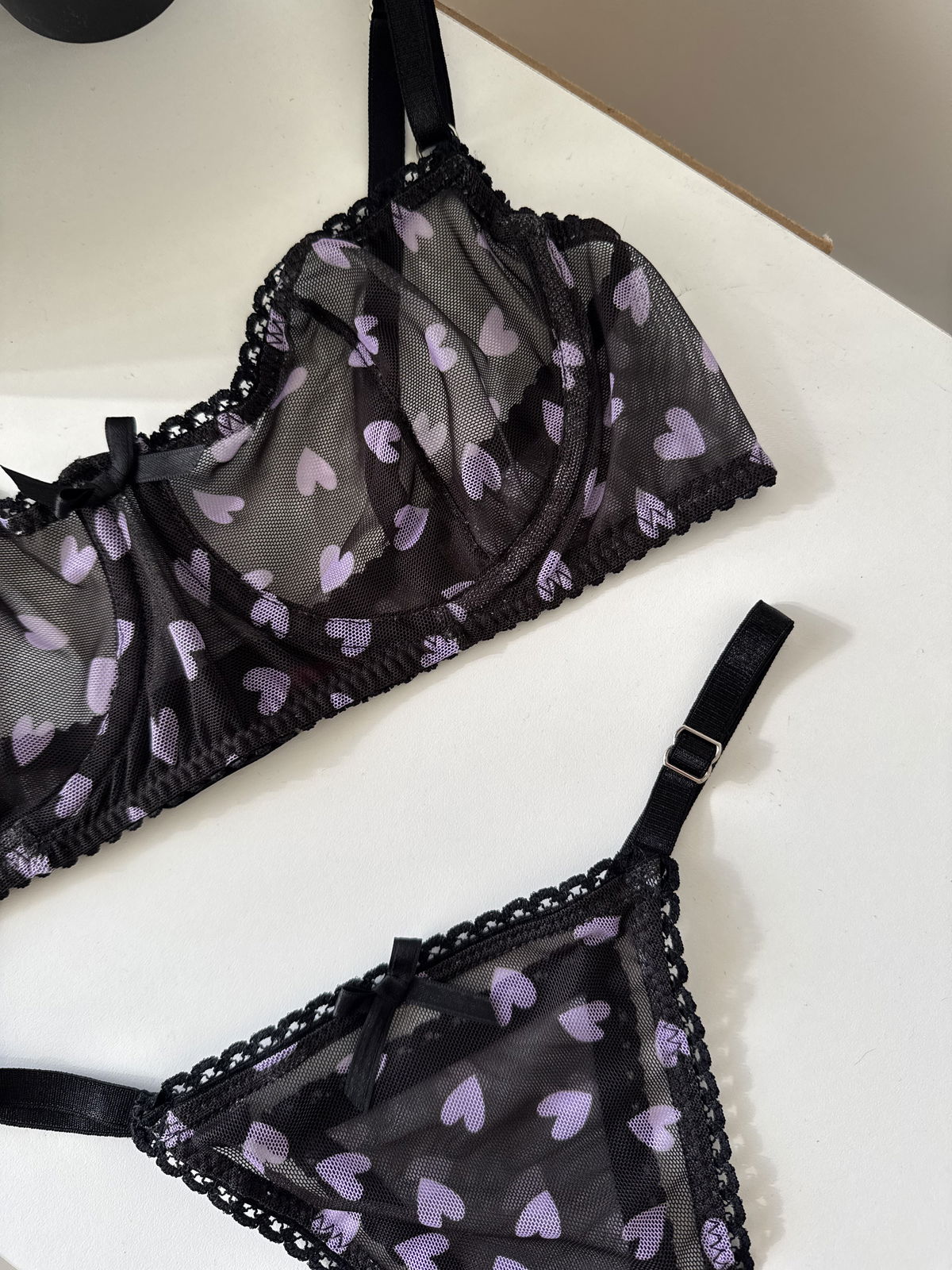 Delicadeza y encanto Confeccionado en microtul premium elastizado, con diseño de corazones a tono lila, este conjunto transmite romanticismo con sutileza.